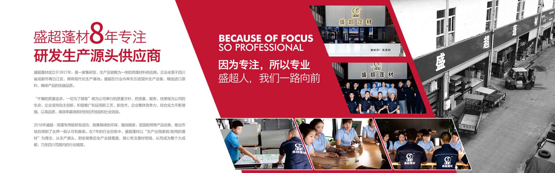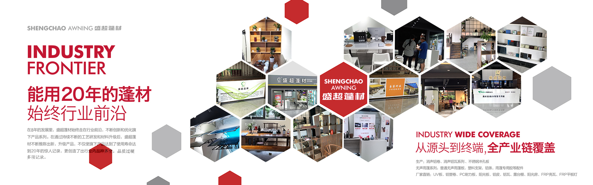 盛超蓬材是由四川超諾商貿(mào)有限公司創(chuàng)辦,是一家集研發(fā)、生產(chǎn)、銷售和服務(wù)于一體的專業(yè)雨蓬供應(yīng)商。主要產(chǎn)品:實心耐力板,中空陽光板、多層板、蜂窩板、鋁瓦、消聲鋁瓦、不銹鋼消聲等材料的雨蓬產(chǎn)品。自主研發(fā)多款雨蓬,擁有自己的專利和檢測報告。其中明星產(chǎn)品新型組裝式雨蓬,擁有組裝簡便,美觀耐用、抗噪音,性價比高等優(yōu)勢,多項檢測指標(biāo)領(lǐng)跑同行業(yè)。受到了市場和經(jīng)銷商的高度認(rèn)可。 公司自成立至今,從銷售到研發(fā)再到生產(chǎn),已經(jīng)過了3次跨越式的發(fā)展。2017年已成為四川雨蓬行業(yè)內(nèi)庫房面積大,員工多的一家公司。產(chǎn)值每年以平均20%的速度快速增長。可以說客戶是我們的老師,和他們合作使我們得到很多的學(xué)習(xí)機(jī)會來提高自身的技術(shù)水平和管理水平,是我們生產(chǎn)和發(fā)展的動力。